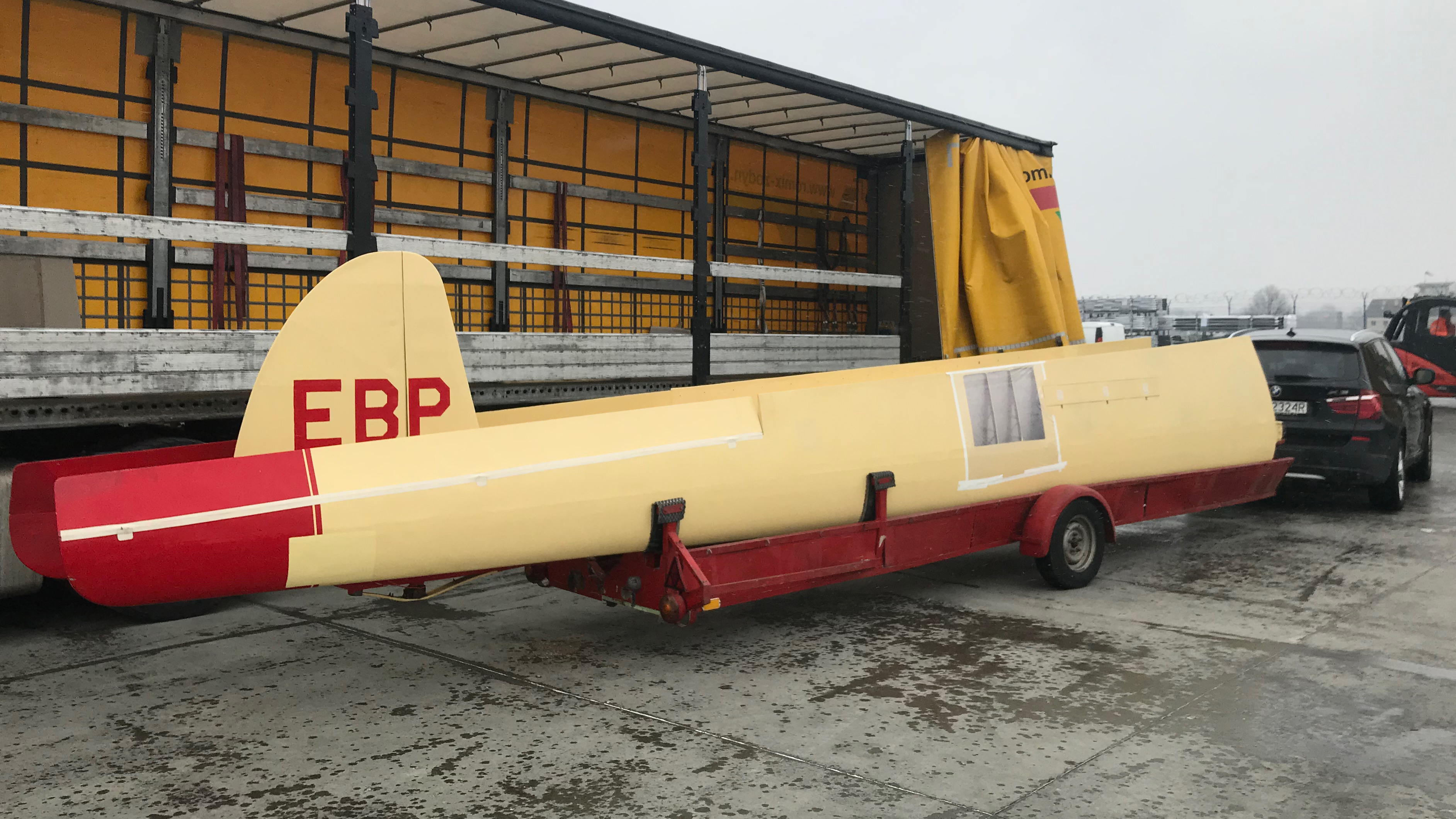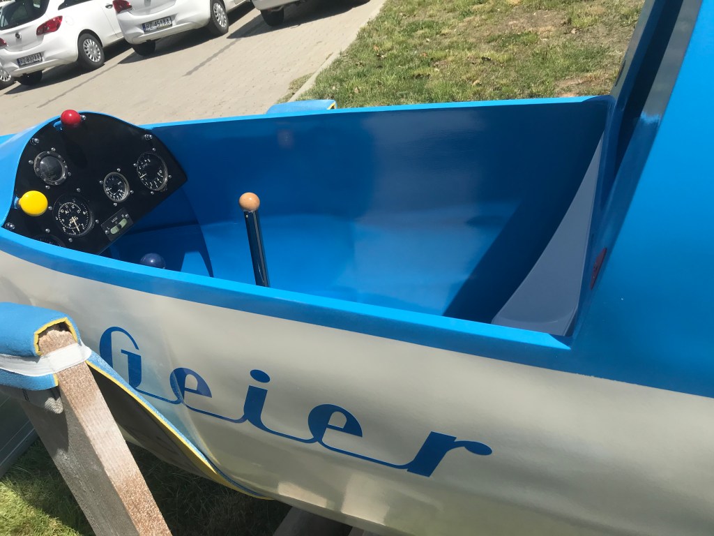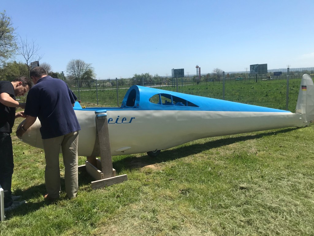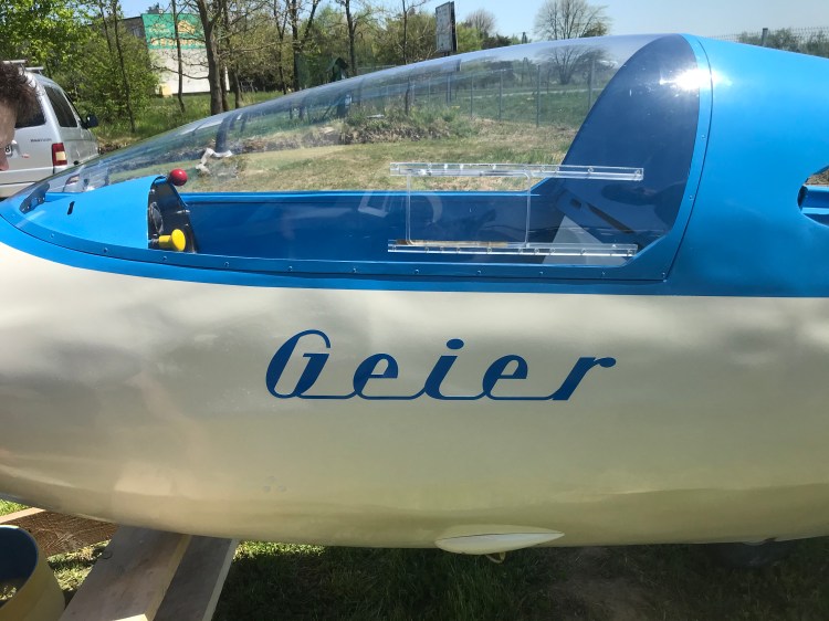 Geier przyjechał z niemieckiego lotniska Kempten-Durach w ciężarówce jeszcze na oryginalnym wózku. We współpracy z zaprzyjaźnioną firmą szybowiec został szybko rozładowany i wyruszyłem w drogę do warsztatu. Długość skrzydeł robi wrażenie jak na szybowiec z lat pięćdziesiątych.
